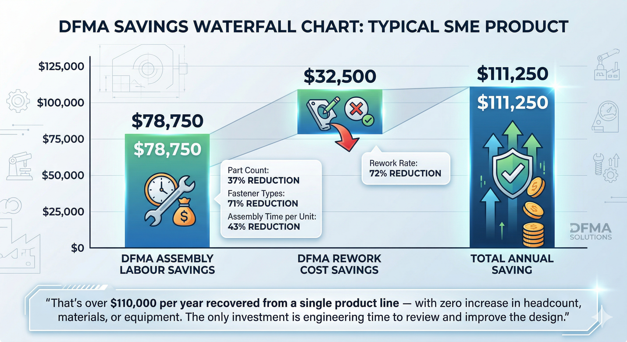 That's over $110,000 per year recovered from a single product line — with zero increase in headcount, materials, or equipment. The only investment is engineering time to review and improve the design.